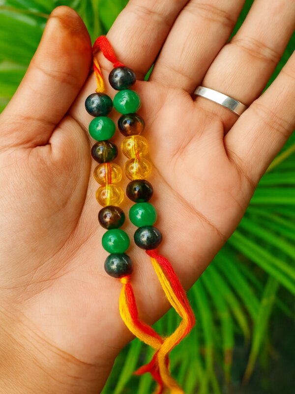 Aesthetics Money Magnet Rakhi – Crafted with intention and elegance, the Aesthetics Money Magnet Rakhi is more than a festive thread—it’s a spiritual talisman designed to attract abundance, prosperity, and success. Made with energized crystals like Pyrite, Citrine, Green Aventurine, and Tiger’s Eye, this Rakhi blends tradition with powerful energy work. Its stylish design and vibrant aura make it a meaningful gift for Raksha Bandhan, symbolizing your wish for your brother’s thriving future.